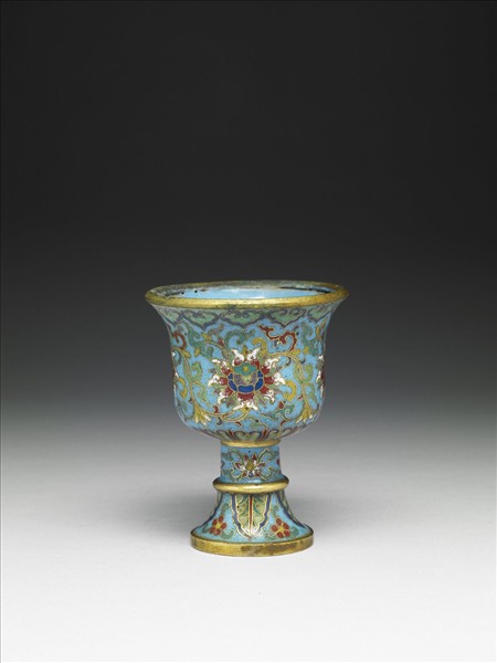 清宮作品,十八世紀。酥油燈為壇廟供物所不可缺,明、清、乃至民國時代,每逢年節慶典皆賞賜大量酥油給藏傳佛教之各大廟宇。此種高足盃原是西藏金屬器的造型,在清宮中以瓷、琺瑯、雕漆、描金漆製作者甚夥。圖為黃銅胎掐絲琺瑯,器裡施素色料,外表淺藍地番蓮、蕉葉圖案。