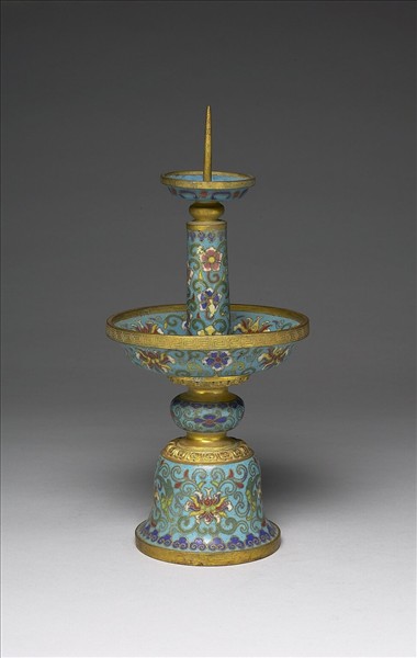 銅胎。由釘形燭阡、支柱、托盤及台座組成。器身以淺藍色為地,以掐絲技法製作花紋,上托盤內側無紋,其餘全器飾番蓮紋與花卉紋,托盤口緣及台座下緣外側飾回紋,台座下端飾如意雲紋邊飾。燭台為五供之一,本器與中琺967~971成套。