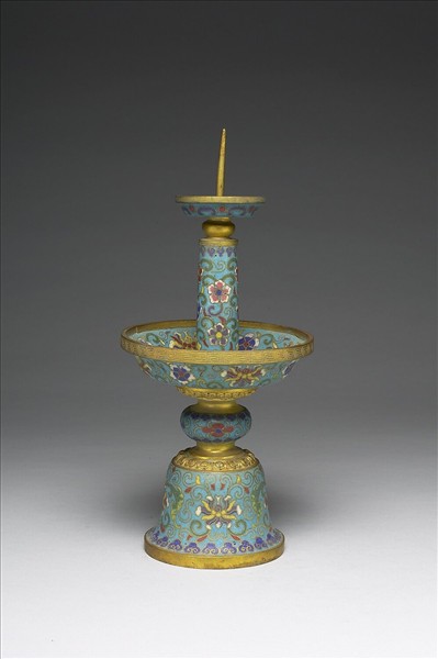 銅胎。由釘形燭阡、支柱、托盤及台座組成。器身以淺藍色為地,以掐絲技法製作花紋,上托盤內側無紋,其餘全器飾番蓮紋與花卉紋,托盤口緣及台座下緣外側飾回紋,台座下端飾如意雲紋邊飾。燭台為五供之一,本器與中琺967~971成套。