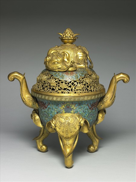 銅胎。侈口,豎邊,深壁,圓底,雙象首形耳,三象鼻形足,帶馱寶山臥象鈕穹頂蓋。全器以淺藍色為地,以掐絲填各色琺瑯技法製作紋飾,蓋頂為如意雲紋開光,中飾番蓮紋,蓋身飾鏤空纏枝蓮花紋,口緣飾回紋,器壁飾纏枝番蓮紋及蝙蝠紋。