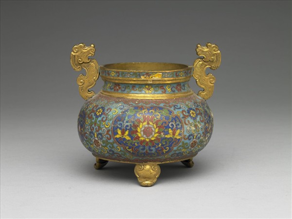直口,短頸,雙螭形耳,斜肩,鼓腹,三如意雲紋足。全器淺藍地,以掐絲技法於口緣飾海棠紋,頸飾葵花紋,腹部上下各飾一圈如意雲紋,四開光內飾番蓮紋,開光隙地飾花卉紋。器底貼長方形金屬片,陰刻「大清乾隆年製」直向單行楷款及一「陶」字。中琺980、981、982為一組。
