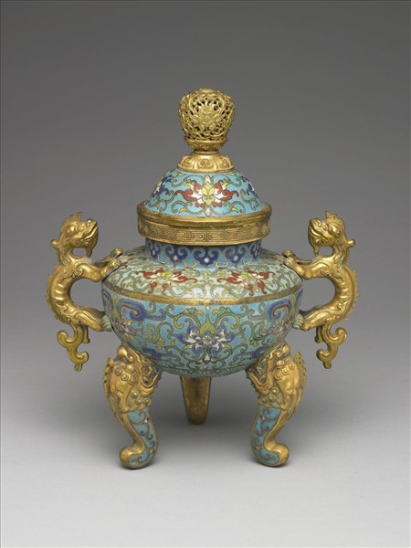 直口,短頸,雙夔龍耳,豐肩,斂腹,圓底,三張口獅足,穹頂蓋,蓮瓣座鏤空蓮紋鈕。口緣陰刻回文,全器淺藍地,以掐絲技法於蓋面、肩與腹飾番蓮紋,頸飾如意雲紋,器底龜背紋中飾六瓣花紋。