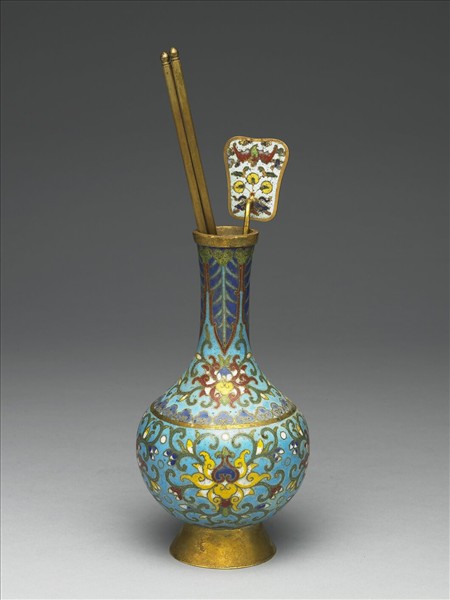 直口,長頸,斜肩,圓腹,圈足。全器淺藍地,以掐絲技法於口緣、肩與腹底飾一圈如意雲紋,頸飾蕉葉紋與番蓮紋,腹飾折枝番蓮紋。附芭蕉葉形銅鏟一,銅箸一雙。