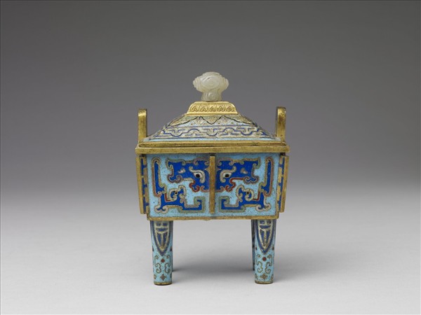 四方形,直口,方腹,雙立耳,四角與四面各一棱脊,四足,梯形蓋,蓮瓣座如意形玉鈕。全器淺藍地,以掐絲技法於蓋頂、足頂飾蕉葉紋,腹部飾獸面紋與龍紋,耳飾回文,器底飾八瓣紋。中琺995、996、997為一組