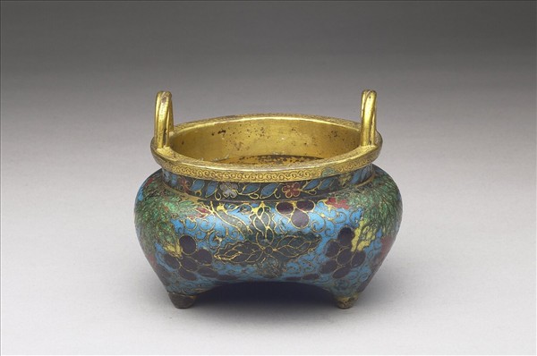 鬲式爐,銅胎,口鑲寬邊,出唇,雙立耳,短頸,三乳足。器表淺藍地掐絲五彩紋飾,頸飾五瓣花葉,腹飾葡萄紋,三足間底部裝飾菊花。是十六世紀初期文物。