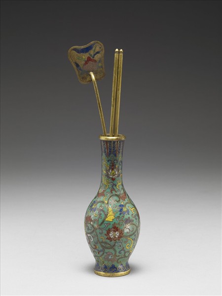 直口,長頸,斜肩,斂腹,撇足。全器綠地,以掐絲技法於口緣飾蕉葉紋,頸與腹部飾番蓮紋,足飾如意雲紋。附芭蕉葉形銅鏟一,銅箸一雙。中琺1004、1005、1006為一組。