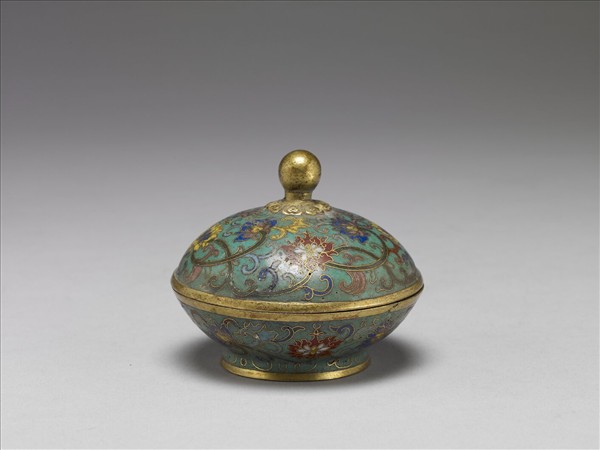子母口,深壁,圈足,子母口蓋,蓮瓣座圓球鈕。全器綠地,以掐絲技法於器表飾番蓮紋,底飾幾何紋。