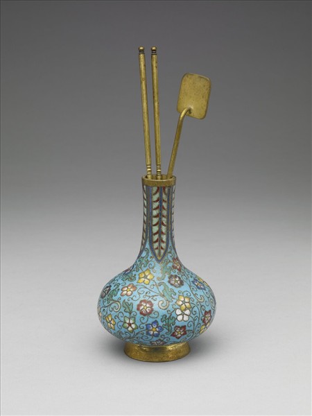 直口,長直頸,溜肩,鼓腹,圈足微撇。全器淺藍地,以掐絲技法於頸飾蕉葉紋,腹飾五瓣花卉紋,腹底飾一圈如意雲紋,圈足露胎。附方形銅鏟一,銅箸一雙。中琺1012、1013、1014為一組。