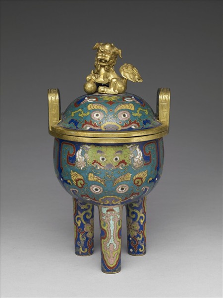 金口唇外突,雙立耳,深壁,三足,穹頂蓋,獅戲球鈕。耳部陰刻回文。全器深藍地,以掐絲技法於蓋與腹飾獸面紋,腹底飾拐子龍紋,足飾五瓣花紋與蕉葉紋。