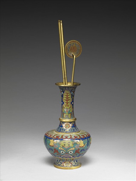 微撇口,長直頸,下方三分之一處飾一凸環將頸部分為兩段,平肩,豐腹下斂,撇圈足。全器深藍地,以掐絲技法於頸飾蕉葉紋、拐子龍紋,肩、腹底飾蓮瓣紋,腹飾獸面紋,足為花卉紋。附圓形內填琺瑯銅鏟一,銅箸一雙。