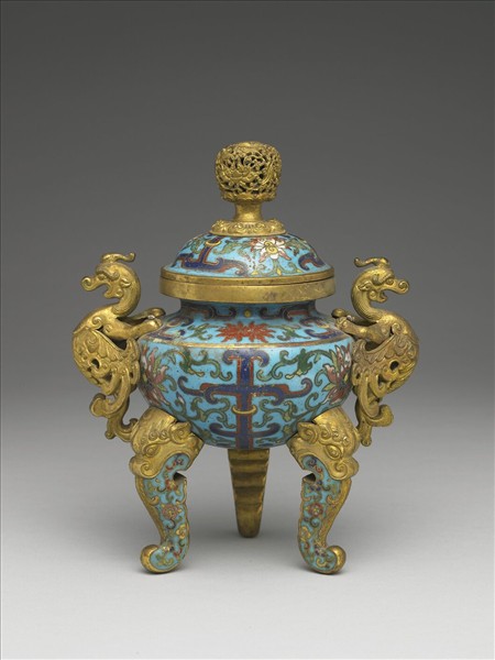 鍍金口,短頸,雙夔龍耳,斜肩,斂腹,三張口吐舌獸足,穹頂蓋,蓮瓣座鏤空蓮紋鈕。全器淺藍地,以掐絲技法於器表飾拐子龍紋與番蓮紋,足飾五瓣花紋。中琺1027、1028、1029為一組。