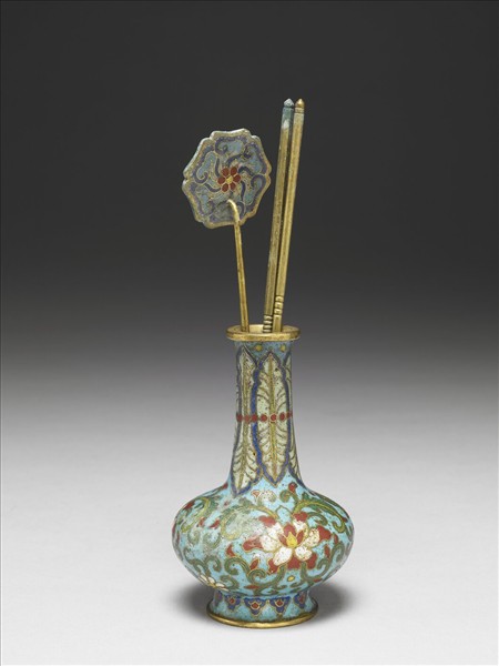 直口,長直頸,斜肩,鼓腹,撇圈足。全器淺藍地,以掐絲技法於頸飾蕉葉紋,腹飾轉枝番蓮紋,足飾如意雲紋。附六葵瓣形掐絲琺瑯銅鏟一,銅箸一雙。中琺1030、1031、1032為一組。