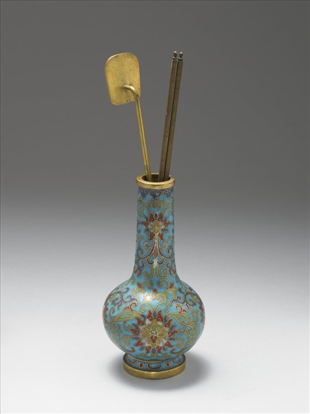 直口,長頸,圓腹,圈足。以掐絲技法為飾,全器淺藍地飾番蓮紋,口沿及腹部下方飾如意雲紋,圈足飾幾何紋。底部露胎陰刻「乾隆年製」橫向四字單行楷款及一「約」字。附光素長柄方形銅鏟一只,銅箸一雙。中琺1041、1042、1043三件一組。
