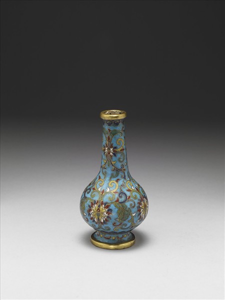 直口,長頸,斜肩,圓腹,圈足。以掐絲技法為飾,全器淺藍地飾番蓮紋,上端口沿及腹部下方飾如意雲紋,圈足飾幾何紋。底部露胎陰刻「乾隆年製」橫向四字單行楷款及一「州」字。中琺1047、1048、1049三件一組。