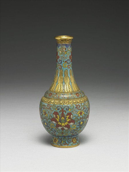 直口,捲唇,長頸,斜肩,圓腹, 圈足。以鑄雕與掐絲琺瑯技法為飾,全器淺藍地,口沿鑄刻卷草紋,下接掐絲如意雲紋及番蓮紋,下緣為鑄雕蕉葉紋,肩部飾掐絲六瓣花紋,腹部上緣有一圈雕鑄蓮瓣紋,下飾掐絲纏枝番蓮紋及如意雲紋邊飾,圈足飾葵花紋。底部露胎陰刻「大清乾隆年製」橫向六字單行楷款及一「雲」字。中琺1053、1054、1055為一組。
