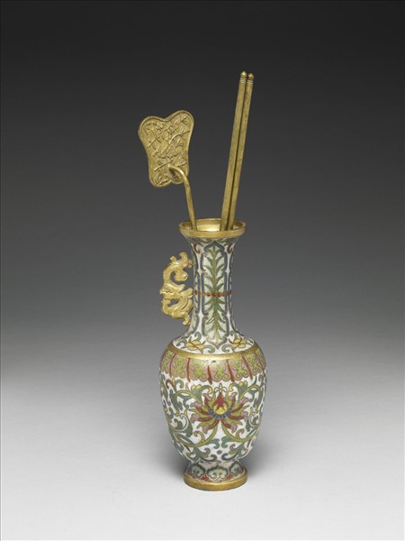 侈口,豎邊,長頸,龍形耳(缺一耳),斜肩,斂腹,外撇圈足。以掐絲琺瑯為飾,全器以白色為底,口沿飾蓮花紋,頸飾蕉葉紋及海棠紋,肩飾蓮瓣紋,腹有纏枝番蓮紋,圈足有如意雲紋。底部露胎。附芭蕉扇形花蝶紋鏟一,箸一副。中琺1056、1057、1058三件一組。