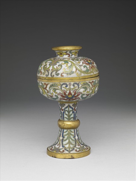 子母口,深壁,高圈足,帶圈足鈕圓頂蓋。以掐絲琺瑯為飾,全器以白色為底,蓋鈕飾海棠紋,蓋沿及器壁飾番蓮紋,圈足上下緣飾蓮花紋,中間飾一圈蕉葉紋。中琺1056、1057、1058三件一組。