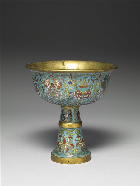 原貼簽曰:「四次佛供」清宮作品,十八世紀。撇口淺壁碗,高圈足向下外敞,足脛以金屬棱分為兩節。銅胎,外壁飾掐絲琺瑯蓮托八吉祥圖樣。在佛供前為酥油燈盞或盛放供品的容器。