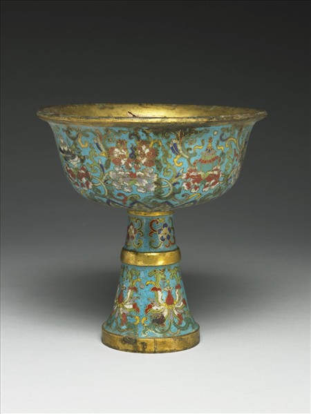 撇口,深壁,高圈足。口緣及內壁露胎,器外以淺藍色地掐絲琺瑯為飾,外壁飾蓮花座八吉祥,底部飾一圈蕉葉紋,足部上段飾五瓣花紋,下段飾番蓮紋。