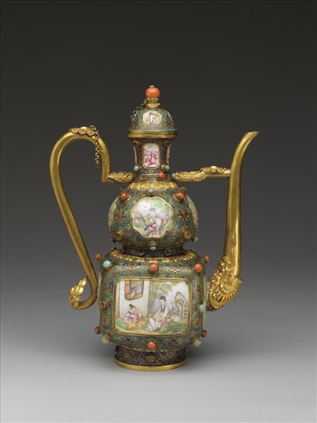 銅胎,蓮瓣座珊瑚珠鈕之覆碗式蓋,蓋以環鍊與把手相連,侈口縮腰式頸,上圓下方略呈葫蘆形的器腹,長流自器腹下方的龍首口中伸出,流口飾回紋,流與頸以龍首橫梁相連,與頸部另一邊的龍首把手相呼應。器表淺藍地飾纏枝番蓮花為錦,於凸起的鑲座上附粘松石、珊瑚為裝飾,蓋、頸、腹各嵌飾畫琺瑯開光,蓋四開光內繪不同的仕女圖,頸部開光內繪各種山水風景,器腹上截四開光內繪不同的仕女圖,下截開光內前後繪庭院課子圖,左右為庭院花蝶及山水房舍。平底陰刻「大清乾隆年製」雙方框宋體字款。