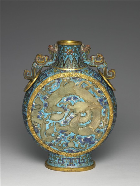 直口,立沿,削肩,扁圓腹,頸肩側有雙轉頸彩鳳帶環耳,橢圓形圈足。器表淺藍地,頸飾番蓮紋及蕉葉紋,腹鑲二玉龍及火珠紋,龍一大一小互相對望,隙地飾藍、白色雲紋,兩側及圈足飾靛藍色鉤連夔紋及花卉紋,口沿、圈足鑄刻回紋邊飾,腹部鑄刻雲水紋浮雕邊飾。此型器皿原來應由皮革製成,盛液體掛在馬背,故稱背壺,也有俗稱此為抱月壺或寶月壺