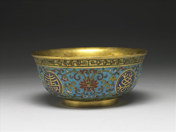 口微撇,深壁,圈足。器表淺藍地,四方有一圓形開光,內各有一深藍地篆體金字:「萬」、「壽」、「無」、「疆」,開光隙地各飾一朵五彩番蓮紋,腹底飾一圈綠地掐絲蓮瓣紋,碗緣飾綠地鍍金製拐子龍紋邊飾。底陰刻「子孫永寶」四字雙行雙方框篆款。