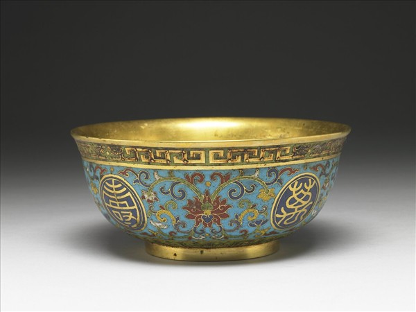 口微撇,深壁,圈足。器表淺藍地,四方有一圓形開光,內各有一深藍地篆體金字:「萬」、「壽」、「無」、「疆」,開光隙地各飾一朵五彩番蓮紋,腹底飾一圈綠地掐絲蓮瓣紋,碗緣飾綠地鍍金製拐子龍紋邊飾。底陰刻「子孫永寶」四字雙行雙方框篆款。