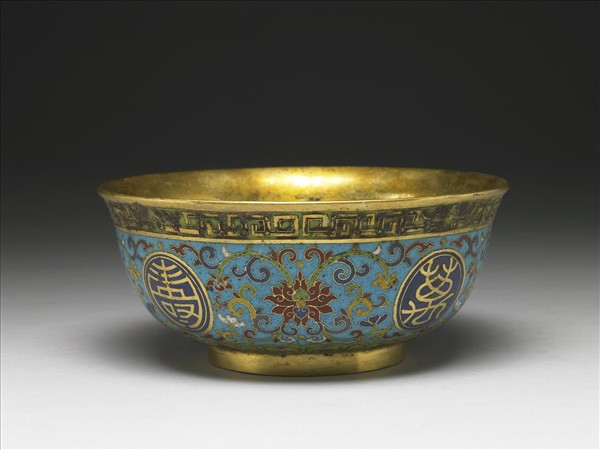 口微撇,深壁,圈足。器表淺藍地,四方有一圓形開光,內各有一深藍地篆體金字:「萬」、「壽」、「無」、「疆」,開光隙地各飾一朵五彩番蓮紋,腹底飾一圈綠地掐絲蓮瓣紋,碗緣飾綠地鍍金製拐子龍紋邊飾。底陰刻「子孫永寶」四字雙行雙方框篆款。