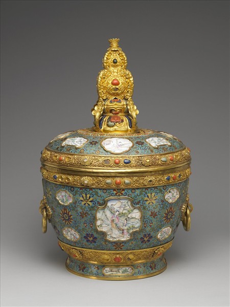 金胎,鑲松石珊瑚蓮瓣座上,矗立由高浮雕卷葉組合成鑲松石珊瑚的大蓋鈕,圈足外侈,腹側鑲雲紋式環耳。罐內鍍金,器表淺藍地,以掐絲技法飾纏枝花錦,間飾開光,蓋面八開光內繪飾景致與母子圖相間,器身十二開光內繪不同的仕女、母子及花蝶圖,圈足四開光處畫山水景致,並於全器鍍金鑲邊上嵌珊瑚青金石和綠松石。