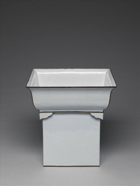 銅胎方形花盆,上層撇口,深弧壁,四角有L型如意雲形足,底部挖空,與下段長直方筒相連。外壁施淺藍色琺瑯釉,內壁及內外底施白色琺瑯釉,全器器緣皆露胎,有使用痕。外底中央以青花書「大清乾隆年製」六字三行篆款。