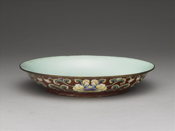 銅胎盤,帶撇口,弧壁,矮圈足。器外壁施深紫紅釉為地,口沿與足圈露胎。外壁以描黑細線繪飾多朵重瓣黃色花卉與葉紋,花色素雅,形狀工整富麗。器內壁施淺藍釉,底部為白地青花「大清乾隆年製」六字篆款。