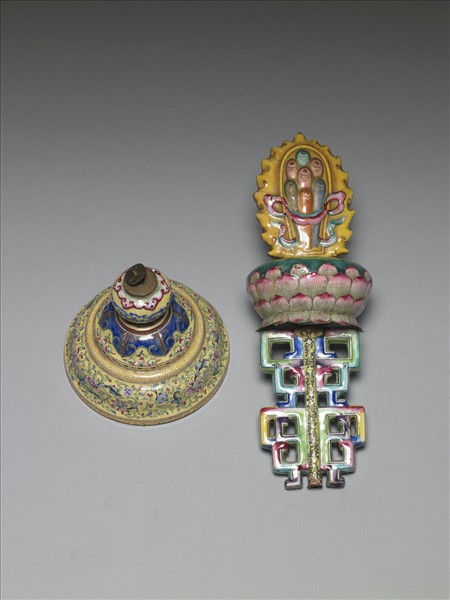 銅胎珠寶,置於一盛開蓮花上方,蓮花下方之多彩幾何承托置於階式穹形底座上,座與承托間帶一圓球。各色珠寶堆疊作三層,外層環以熊熊火焰,下方有紅與綠兩飄帶纏繞。蓮花座頂端繪有蓮蓬,側邊為蓮瓣。底座與上方圓球表面以黃釉為地,球身上下繪如意雲紋,中間為藍色行龍。底座由上而下依序繪有藍地如意雲紋、花葉紋、回紋、工整富麗之轉枝花卉,底緣則為雙圈絞絲紋。座內底施藍釉,中心可見鎖住承托之零件。寶珠能聚現四方寶貨,滿足飲食思想皆如人意,又因此可稱為如意珠。