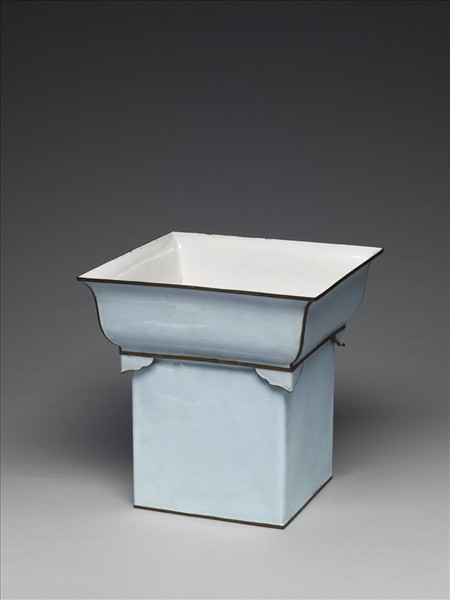 銅胎方形花盆,上層撇口,深弧壁,四角有L型如意雲形足,底部挖空,與下段長直方筒相連。外壁施淺藍色琺瑯釉,內壁及內外底施白色琺瑯釉,全器器緣皆露胎。外底中央以青花書「大清乾隆年製」六字三行篆款。