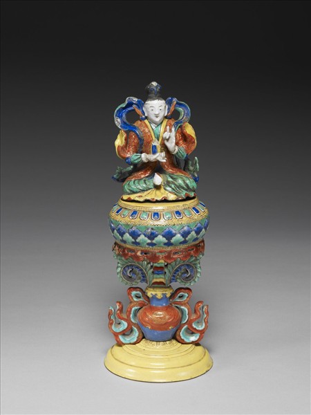銅胎女寶,結跏趺坐於圓形座上,座下為一瓶形承托置於穹形底座上,瓶身與圓形座間帶中柱與對稱捲葉。女寶頂繫高髮髻,細眉狹目,面容祥和。其身穿紅袍,周身環繞藍色飄帶,右手掌心朝上捧一物件,左手掌心朝前,食指與小指翹起。圓形座側邊繪有俯蓮瓣紋與葉紋,底部帶有一圈突出如意雲紋。底座上方之瓶身紅藍交雜,周圍並環飾雙色飄帶,中柱並塗以黃、綠、紅、藍釉。底座滿施黃釉並帶有多圈弦紋。座內底施白釉,中心可見鎖住承托之零件。女寶又稱玉女寶或女眷,因美好聰慧的女性是齊家興邦之所需,貞靜賢德之后則可輔佐君主,母儀天下。