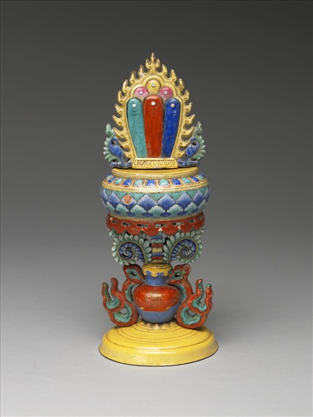 銅胎珠寶,立於圓形座上,座下為一瓶形承托置於穹形底座上,瓶身與圓形座間帶中柱與對稱捲葉。各色寶珠疊作兩層,外緣飾以熊熊火焰,側邊並帶有對稱捲葉紋。圓形座側邊繪有俯蓮瓣紋與葉紋,底部帶有一圈突出如意雲紋。底座上方之瓶身紅藍交雜,周圍並環飾雙色飄帶,中柱並塗以黃、綠、紅、藍釉。底座滿施黃釉並帶有多圈弦紋。座內底施白釉,中心可見鎖住承托之零件。寶珠能聚現四方寶貨,滿足飲食思想皆如人意,又因此可稱為如意珠。