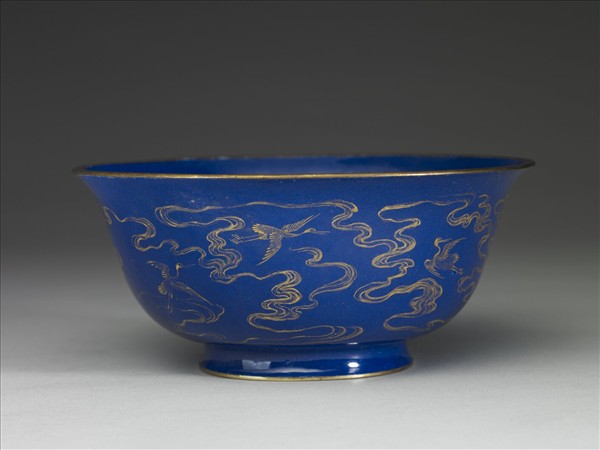 碗侈口,深壁漸斂,弧底,圈足外撇。器內外施以霽青釉,口緣與足緣皆描金一圈。器外壁繪仙鶴飛舞於雲中為飾,其雲氣四皆由下方升起,仙鶴便繪於雲氣左右盤繞所圍出的空間中,仙鶴或展翅前翔、或拍翅暫駐、或扭身回首,姿態個個不同,但彼此的距離相去不大,可說是變化之中隱含秩序感的設計。底外藍地金彩書「大清乾隆年製」三行六字篆款。