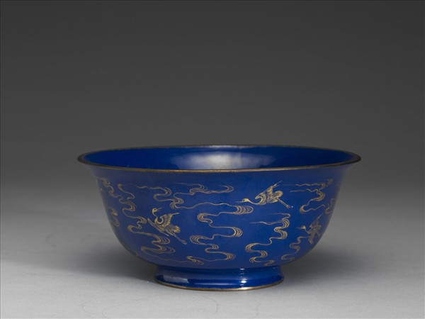 碗侈口,深壁漸斂,弧底,圈足外撇。器內外施以霽青釉,口緣與足緣皆描金一圈。器外壁繪仙鶴飛舞於雲中為飾,其雲氣四皆由下方升起,仙鶴便繪於雲氣左右盤繞所圍出的空間中,仙鶴或展翅前翔、或拍翅暫駐、或扭身回首,姿態個個不同,但彼此的距離相去不大,可說是變化之中隱含秩序感的設計。底外藍地金彩書「大清乾隆年製」三行六字篆款。