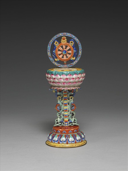 銅胎輪寶,置於盛開並已結實的蓮花上,周遭帶一圓環。蓮莖旁帶對稱捲葉紋,下方為蓮瓣紋穹形底座。紅色輪寶中心為一太極圖案,輪心外有八道輻輳呈放射狀,象徵佛教中的八道輪迴。輪外帶藍色光環,環上嵌飾紅與綠色料石。環繞法輪的圓環以淺藍釉為地並飾朵花紋。代表蓮莖之中柱交替繪飾黃、綠、紅、藍釉,兩旁葉紋亦繽紛多彩。圓形蓮瓣紋底座側邊依序繪一圈藍色如意雲紋與俯蓮瓣紋。座內底施白釉,中心可見鎖住中柱之零件。輪寶因為其車輪形象象徵佛法玄妙圓滿。