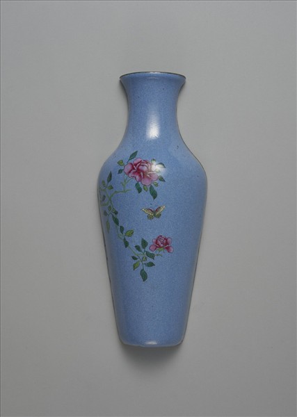 銅胎轎瓶,瓶作半圓扁形,撇口,長束頸,豐肩,長斂腹。器身背面平坦且塗滿白釉,頸部帶兩孔可供靠牆懸掛。 器外壁施藍釉,釉色光潤勻亮,帶芝麻般細點紋。腹面左上方橫出枝條,上有兩朵粉紅色茶花,上方有一彩蝶翩翩飛舞,蝶翼花紋細膩雅緻。器內施湖藍色釉。此種瓶稱作壁瓶,清檔中稱之轎瓶,通常懸掛於牆上或輦轎中,並盛行於乾隆時期。