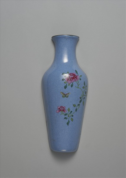 銅胎轎瓶,瓶作半圓扁形,撇口,長束頸,豐肩,長斂腹。器身背面平坦且塗滿白釉,頸部帶兩孔可供靠牆懸掛。 器外壁施藍釉,釉色光潤勻亮,帶芝麻般細點紋。腹面右上方橫出枝條,上有兩朵粉紅色茶花,花朵間方有一彩蝶翩翩飛舞,蝶翼花紋細膩雅緻。器內施湖藍色釉。此種瓶稱作壁瓶,清檔中稱之轎瓶,通常懸掛於牆上或輦轎中,並盛行於乾隆時期。
