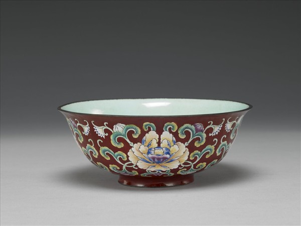 銅胎碗,微撇口,弧壁,矮圈足。器外壁施紫紅釉為地,口沿與足圈露胎。外壁以描黑細線繪飾四朵橙黃色重瓣花卉,花瓣上繪飾多道細線,內側為橙黃色,外側為藍色,花色素雅。花朵周邊延伸出多道對稱葉紋,並兼有多朵含苞花,形狀工整富麗。器內壁施淺藍釉,圈足內底為白地,書有「大清乾隆年製」六字青花篆款。