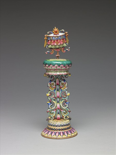 銅胎畫琺瑯,五彩寶蓋(勝利幢),上有火珠,置於有綠色蓮蓬的蓮座上,下以五彩卷葉承托,底座座面黃地,中央繪花卉紋,側邊繪草葉紋、回紋及點紋,底緣飾一圈環帶紋。座內側施湖綠釉。