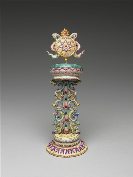 銅胎畫琺瑯,繪有五彩圖案的金色法輪,上有火珠,置於有綠色蓮蓬的蓮座上,下以五彩卷葉承托,底座座面黃地,中央繪花卉紋,側邊繪草葉紋、回紋及點紋,底緣飾一圈環帶紋。座內側施湖綠釉。