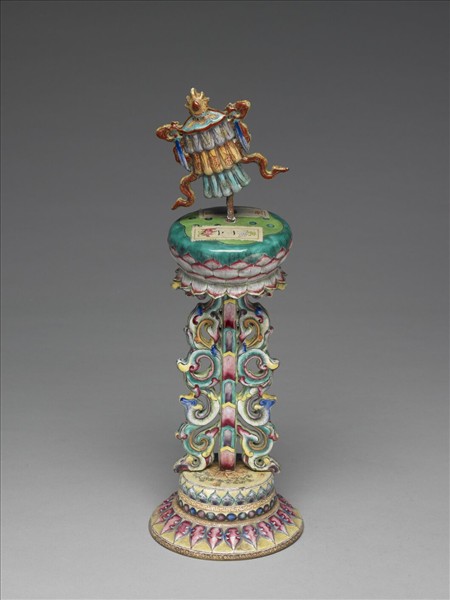 銅胎畫琺瑯,五彩寶傘,上有火珠,置於有綠色蓮蓬的蓮座上,下以五彩卷葉承托,底座座面黃地,中央繪花卉紋,側邊繪草葉紋、回紋及點紋,底緣飾一圈環帶紋。座內側施湖綠釉。