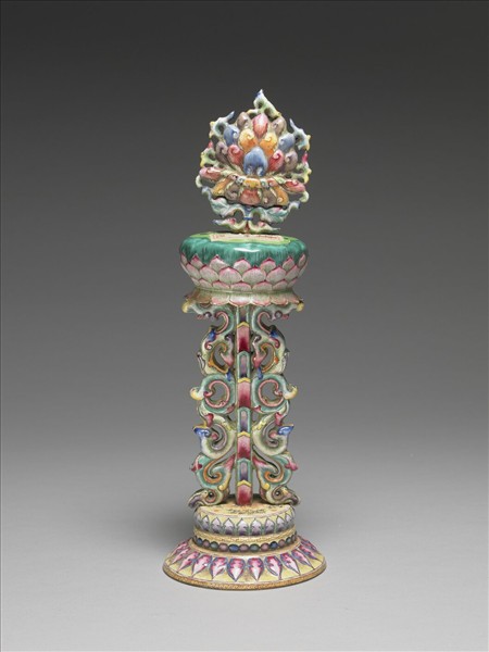 銅胎畫琺瑯,五彩蓮花置於有綠色蓮蓬的蓮座上,下以五彩卷葉承托,底座座面黃地,中央繪花卉紋,側邊繪草葉紋、回紋及點紋,底緣飾一圈環帶紋。座內側施湖綠釉。