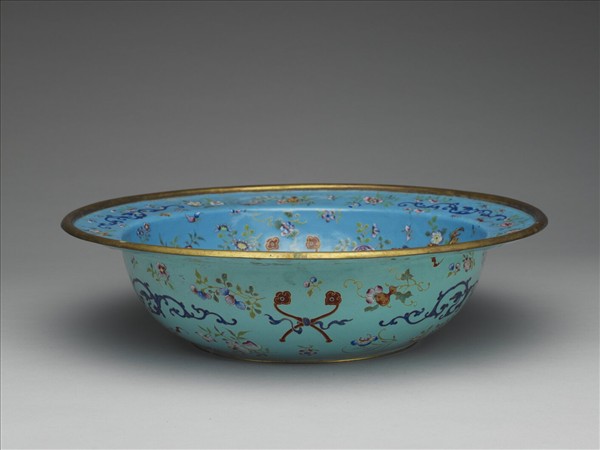 銅胎。侈口,寬折沿,有邊棱,弧壁,平底。全器施藍色釉,盆心飾一團壽字,外圍一圈如意雲紋,周圍有五隻紅色蝙蝠,意寓「五福拱壽」;內壁分列三對紅色如意,折沿面上分列三隻藍色夔龍紋,隙地繪製小蝙蝠及各種花果,如杏、桃、梅、菊、芙蓉、月季、葫蘆、佛手、石榴等。外壁如意與夔龍相間排列,隙地亦繪有小蝙蝠與折枝花果,折沿下方繪一圈折枝花果紋,外底為粉紅色,中央有一隻淡綠色夔龍,周圍環繞藍色祥雲及紅色蝙蝠,釉色明亮。底緣及邊棱露胎鍍金。