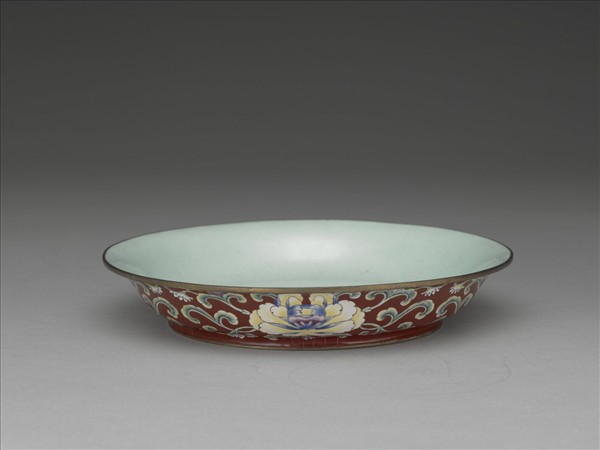 銅胎敞口盤,弧壁下斂,平底,圈足,器口沿與足緣露胎。器內壁施湖綠釉,外壁以深紅釉為地,等距繪四朵盛開的黃色花卉,花卉兩側則飾以含苞花、卷葉,盛開黃色花朵的兩側紋飾大致對稱,只在含苞花顏色上有所不同。花色素雅,形狀工整富麗。足內白釉地,釉上青色書「大清乾隆年製」三行六字篆款。