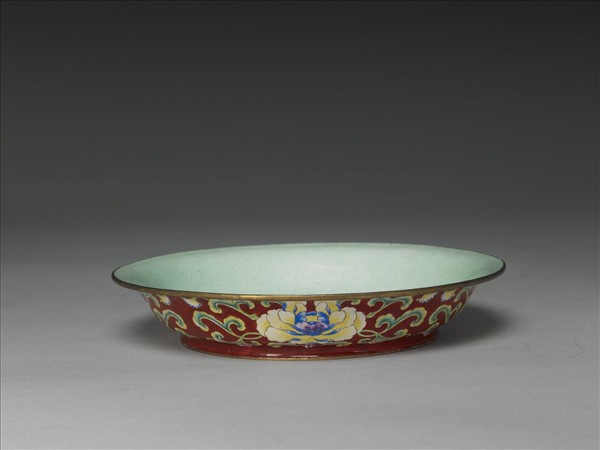 銅胎敞口盤,弧壁下斂,平底,圈足,器口沿與足緣露胎。器內壁施湖綠釉,外壁以深紅釉為地,等距繪四朵盛開的黃色花卉,花卉兩側則飾以含苞花、卷葉,盛開黃色花朵的兩側紋飾大致對稱,只在含苞花顏色上有所不同。花色素雅,形狀工整富麗。足內白釉地,釉上青色書「大清乾隆年製」三行六字篆款。