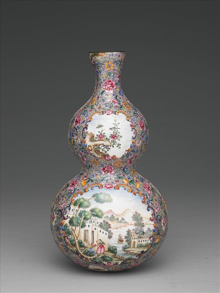 銅胎葫蘆形轎瓶,器身正面施淺色釉,密佈紫色點紋為地,並於上密密繪滿捲枝花葉紋。瓶身上下端各帶圓形開光,周緣繞飾幾何化之葉紋與朵花,上開光繪中國花鳥圖,並有蝴蝶翩翩飛舞;下開光繪飾西洋風景,前景有兩人物立於西式屋舍前,遠方山水與近景樹木皆呈現西洋趣味。器背平坦且塗滿白釉,頸部帶兩孔可供靠牆懸掛。底座內施白釉。此種瓶稱作壁瓶,清檔中稱之轎瓶,並盛行於乾隆時期。