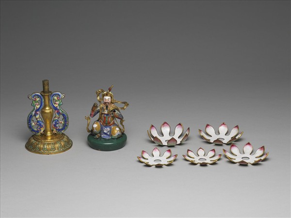 銅胎畫琺瑯,一武將蹲踞於蓮蓬上,下襯蓮花托,插有蓮花托的蕉葉紋瓶立於莨苕葉紋座上,兩側飾有一對琺瑯彩夔龍裝飾。武將為七政寶中捍衛疆土的主兵臣寶,七政寶是輪轉王治國之寶,也稱為七珍,中琺1298-1304為一組完整的七政寶。